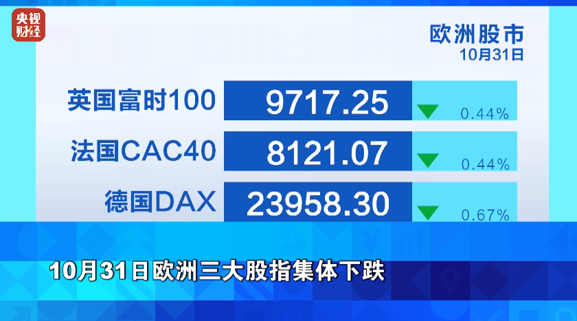 本周五,欧盟统计局发布的数据显示,欧元区10月的年通胀率为2.1%,低于9月的2.2%,这一数据印证了欧洲央行前一日决定维持利率不变的合理性。由于本周多家知名企业财报喜忧参半,市场交投持续谨慎,欧股持续表现疲软,截至收盘,欧洲三大股指全线下跌。其中英国富时100指数跌0.44%,法国CAC40指数跌0.44%,德国DAX指数跌0.67%。